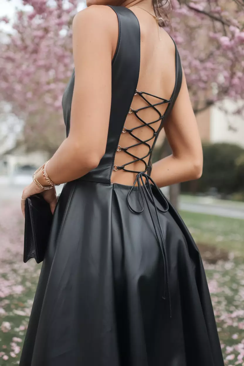 You’ll turn heads in this black midi dress with its eye-catching lace-up back detail.