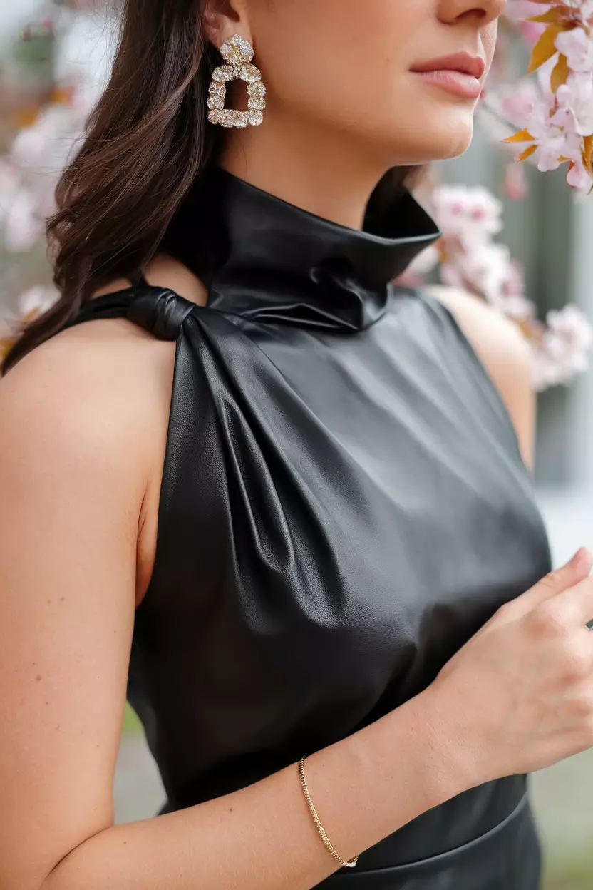 Black Faux Leather High Neck Twist Shoulder Maxi Dress